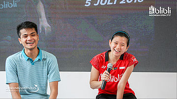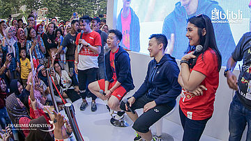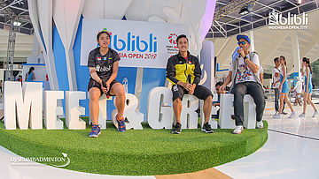 Suasana meet and greet Gregoria Mariska TUNJUNG dan Anthony Sinisuka GINTING (Indonesia) di booth BLIBLI