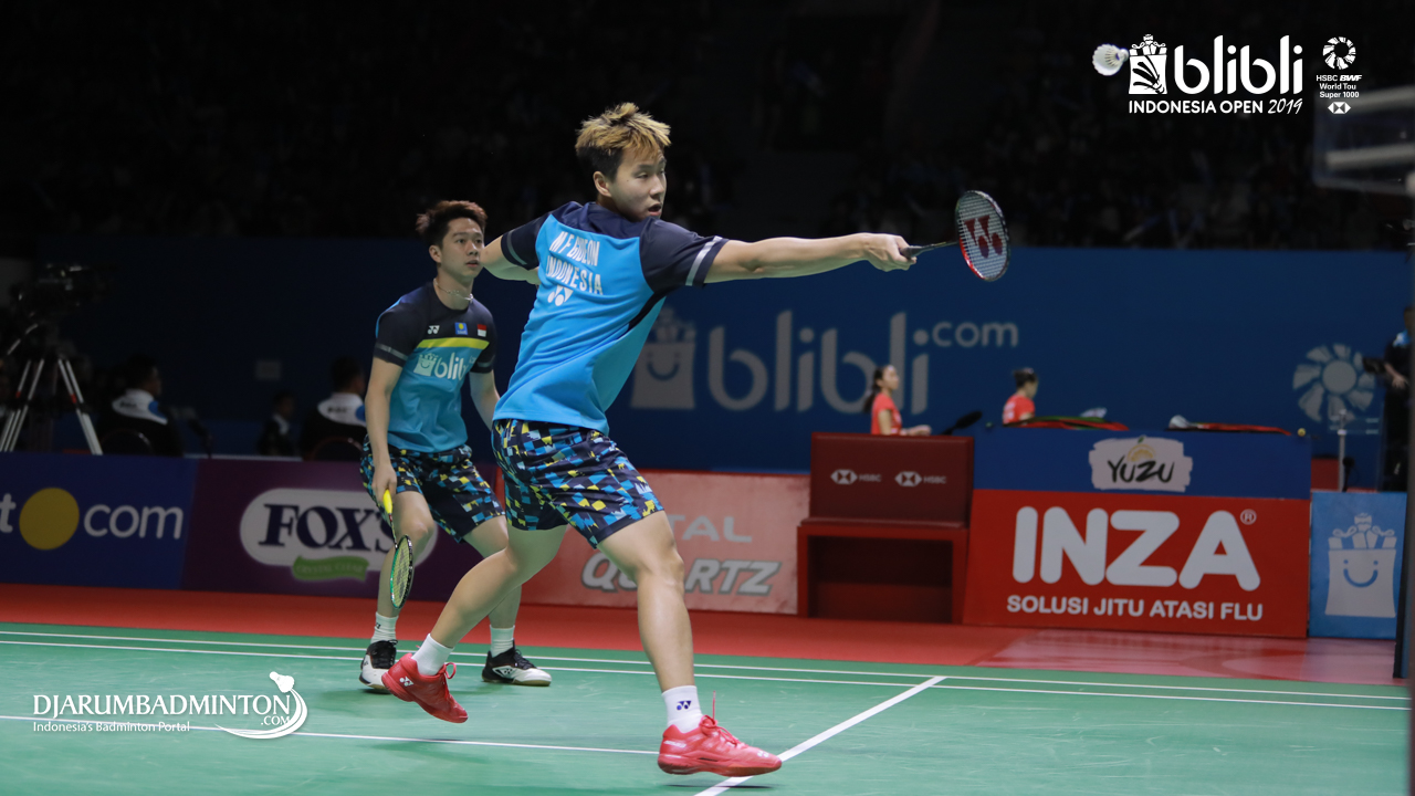 Marcus Fernaldi GIDEON/Kevin Sanjaya SUKAMULJO (Indonesia) mengembalikan serangan