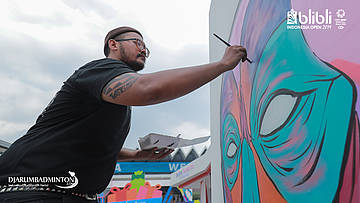 Salah seorang sedang membuat mural di area Blibli Indonesia Open 2019