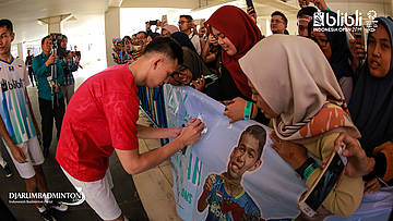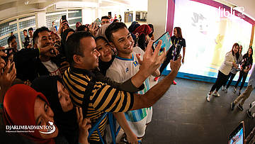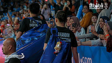 Para fans menyambut kedatangan Tontowi AHMAD dan Winny Oktavina KANDOW (INA) saat ingin bertanding