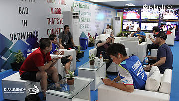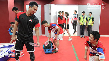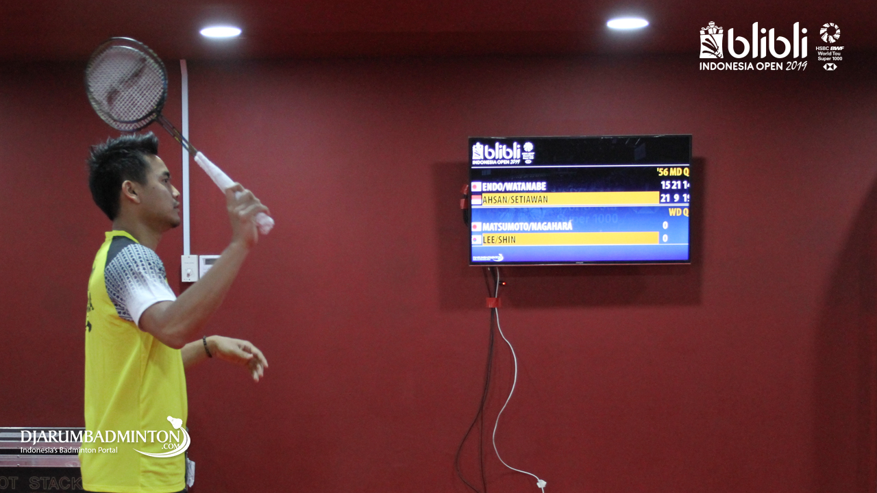 M Ahsan berbincang dengan Hiroyuki Endo saat melakukan persiapan di Players Services