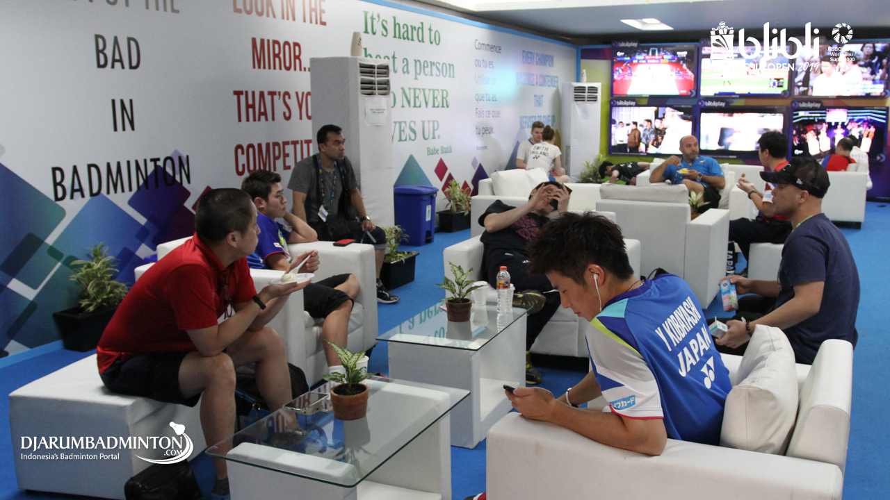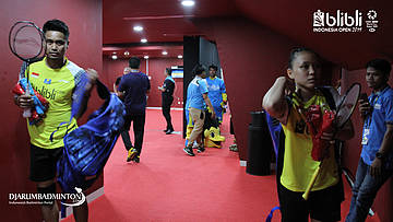 Tontowi Ahmad melakukan pemanasan di Players Services