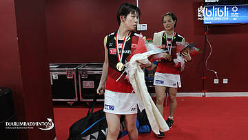 Sayaka Hirota (kiri) dan Yuki Fukushima di Players Services seusai bertanding