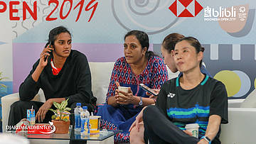 Pusarva V Sindhu (kiri) bersama ibunda dan pelatihnya di Players Lounge
