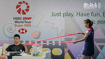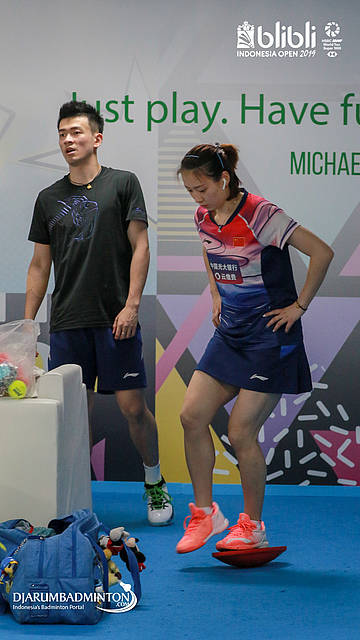 Zheng Si Wei (kiri) dan Huang Ya Qiong melakukan pemanasan di Players Lounge