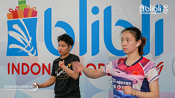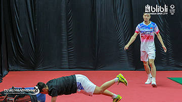 Huang Dong Ping (kiri) dan Wang Yi Lyu melakukan pemanasan di Warming Up Hall