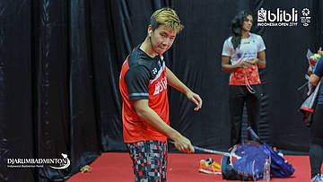 Marcus Fernaldi Gideon melakukan pemanasan di Warming Up Hall