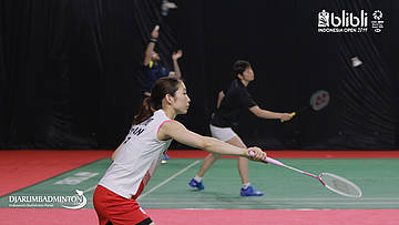 Misaki Matsutomo (kiri) dan Sayaka Hirota melakukan pemanasan di Warming Up Hall