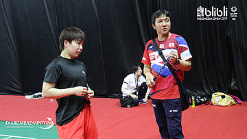 Akane Yamaguchi melakukan pemanasan bersama pelatihnya di Warming Up Hall