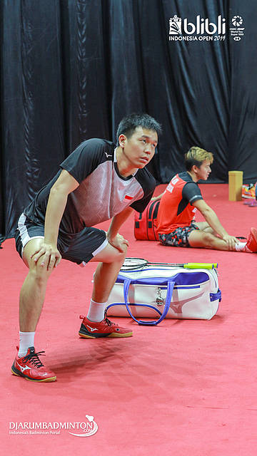 Hendra Setiawan (kiri) dan Marcus Fernaldi Gideon melakukan pemanasan di Warming Up Hall