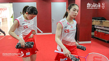 Ayaka Takahashi dan Misaki Matsutomo (kanan) bersiap di Players Services