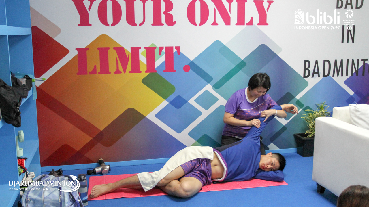 Chou Tien Chen melakukan peregangan otot di Players Lounge