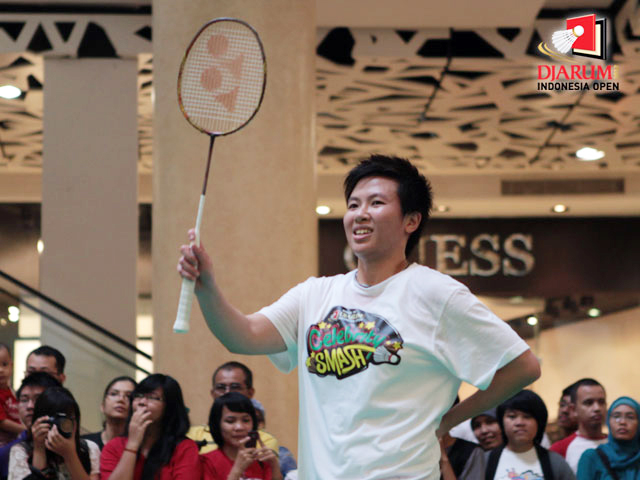 Pose Arumi Bachsin saat membalas pukulan kok audiensi terpilih di Celebrity Smash 2012