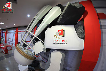 Ornamen badminton dengan futuristik tersaji di dalam area Istora Senayan Jakarta jelang dimulainya Djarum Indonesia Open 2012.
