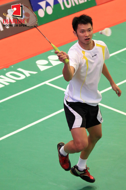 Lee Yong Dae bersiap melakukan pemanasan di Istora Senayan Jakarta.