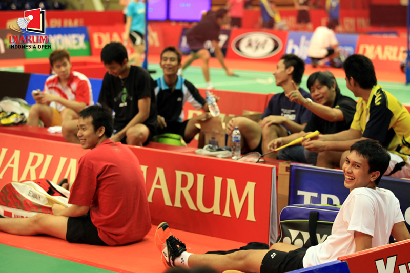 Beberapa pemain Indonesia bersenda gurau saat selesai berlatih di Istora Senayan Jakarta.