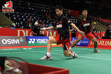 Pasangan Indonesia, Kevin Sanjaya (kiri) dan Rafiddias Akhdan berusaha mengembalikan kok ke arah pasangan Putra Arsya Isnanu/Hantoro di babak kualifikasi pertama Djarum Indonesia Open 2012.