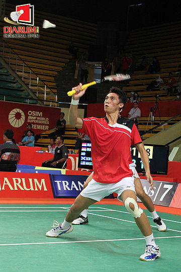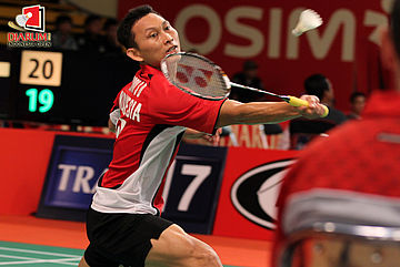 Pemain Indonesia, Sony Dwi Kuncoro berusaha mengembalikan kok ke arah pemain India, Anand Pawar di babak kualifikasi pertama Djarum Indonesia Open 2012.