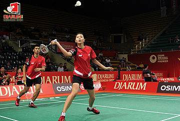 Pasangan ganda campuran Indonesia, Gloria Emmanule (kanan) dan rekannya, Alfian Eko Prasetya berusaha mengembalikan kok ke arah pasangan asal PB Djarum Putra Arsya Isnanu/Surya Della di babak kualifikasi pertama Djarum Indonesia Open 2012.