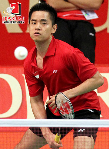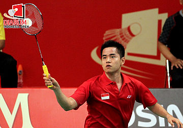 Pemain Indonesia, Simon Santoso kala berlaga melawan pemain Hong Kong, Wong Wing Ki.