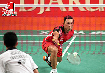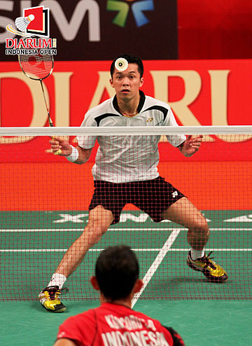 Pemain Indonesia Taufik Hidayat, berusaha mengembalikan kok ke arah pemain Indonesia, Sony Dwi Kuncoro.