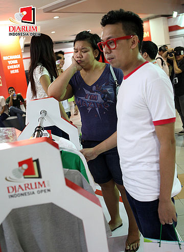 Personel Project P, Udjo, dan Tike Pangabean ketika berkunjung ke booth merchandise Djarum Indonesia Open 2012.