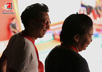 Personel Project P, Udjo (kiri) dan Tike Pangabean tengah menyaksikan pertandingan Djarum Indonesia Open 2012.