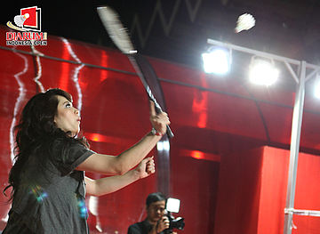 Artis Indonesia, Maghdalena mencoba bermain badminton di mini court yang terletak di Istora Senayan Jakarta.