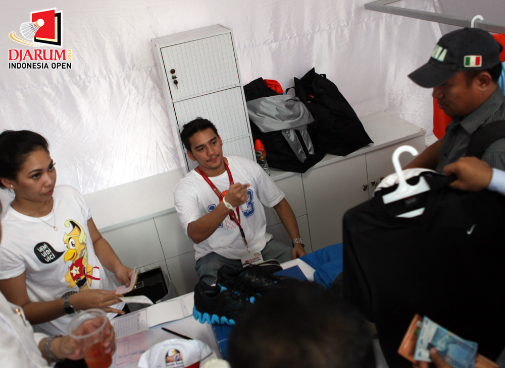 Artis Indonesia, Mario Lawalata tengah melayani pembeli di booth miliknya di Celebrity Bazaar, Djarum Indonesia Open 2012.