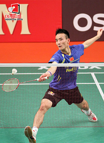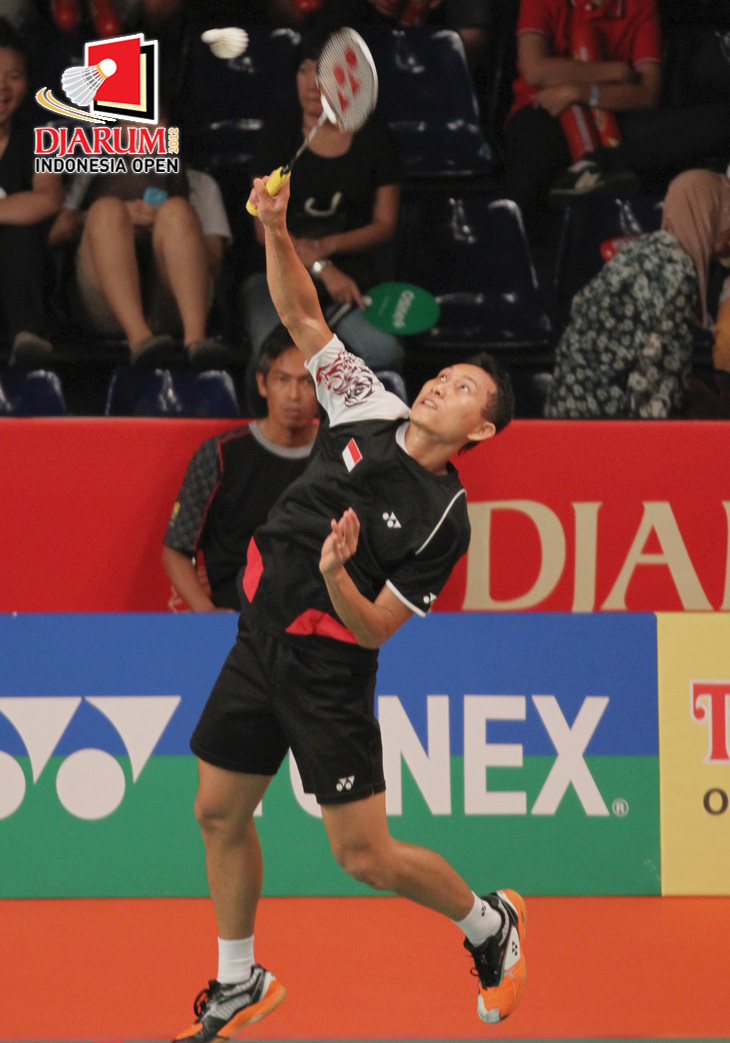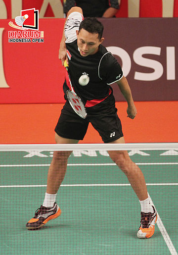 Pemain Indonesia, Sony Dwi Kuncoro berusaha mengembalikan kok ke arah pemain China, Du Pengyu