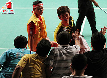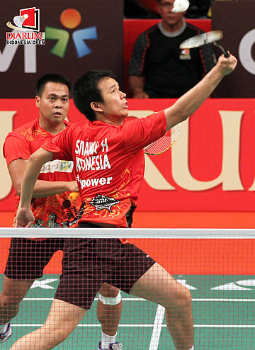 Pasangan Korea Selatan, Jae Sung/Lee Yong Dae berusaha mengembalikan kok ke arah pasangan Indonesia Hendra Setiawan/Markis Kido.