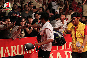 Pemain Indonesia, Simon Santoso menyalami penonton usai menang melawan Kashyap Parupalli.