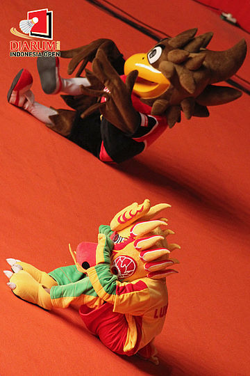 Maskot Indonesia, DIO (kiri) dan maskot China, Lung Lung.