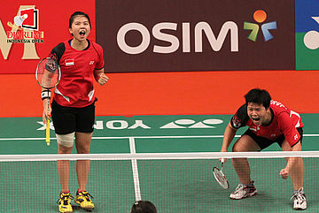 Pasangan Indonesia, Greysia Polii/Meiliana Jauhari berusaha mengembalikan kok ke arah pasangan asal China, Tian Qing/Zhao Yunlei.