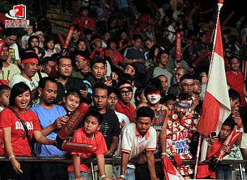 Ekspresi suporter Indonesia ketika menyaksikan final Djarum Indonesia Open 2012.