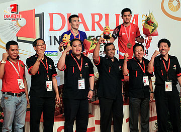 Juara tunggal putra DIO 2012, Simon Santoso dan runner up, Du Pengyu berpose bersama dengan panitia Djarum Indonesia Open 2012.