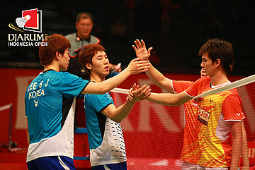 Pasangan Indonesia Andrei Adistia/Markus Fernaldi Gideon (kanan) saat bersalaman dengan pasangan Korea Selatan, Kang Ji Wook/Sang Joon Lee (kiri).