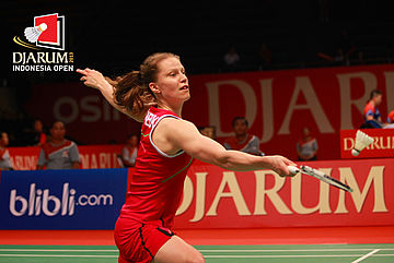 Juliane Schenk (Jerman) mengembalikan shuttlecock ke arah Nichaon Jindapon (Thailand).