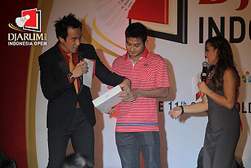 Muhammad Ulinnuha (tengah) mendapatkan hadiah undia Ipad 2 pada acara Gala Dinner Djarum Indonesia Open Super Series Premier 2013.