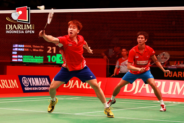 Pasangan ganda putra Malaysia, Thien How Hoon/Wee Kiong Tan menghadang serangan yang dilancarkan Andrei Adistia/Markus Fernaldi Gideon (Indonesia).