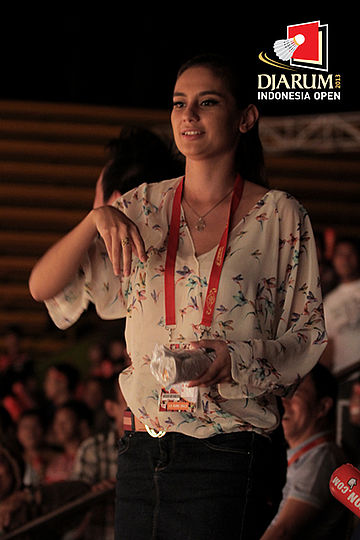 VJ Marissa bersiap melemparkan merchandise kepada pengunjung yang memadati tribun Istora Senayan.