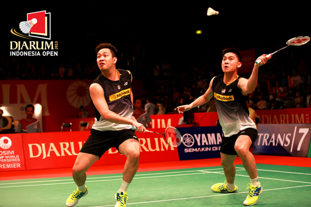 Alvent Yulianto Chandra/Markis Kido (Indonesia) melepaskan backhand ke arah pasangan Kien Keat Koo/Boon Heong Tan (Malaysia).