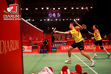 Chris Adcock/Andrew Ellis (Inggris) saat akan memasuki lapangan pertandingan.