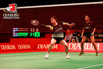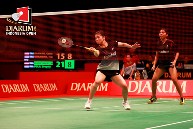 Nitya Krishinda Maheswari/Greysia Polii (Indonesia) mengembalikan shuttlecock ke arah pasangan ganda putri asal Indonesia, Gebby Ristiyani Imawan/Tiara Rosalia Nuraidah.