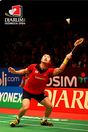 Sho Sasaki (Jepang) bersiap mengembalikan shuttlecock ke arah Bonsak Ponsana (Thailand).