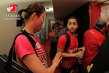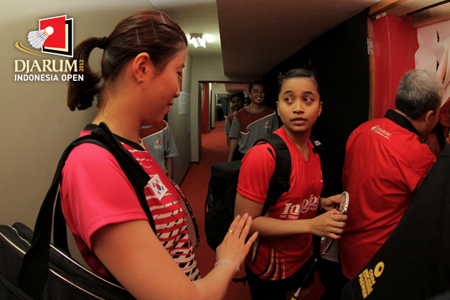 Tunggal putri asal Indonesia, Hera Desi (kanan) saat berbincang dengan Bae Yeon Ju (Korea Selatan) sebelum keduanya saling bertanding.