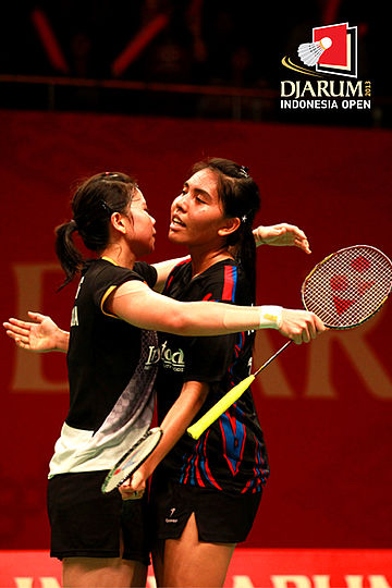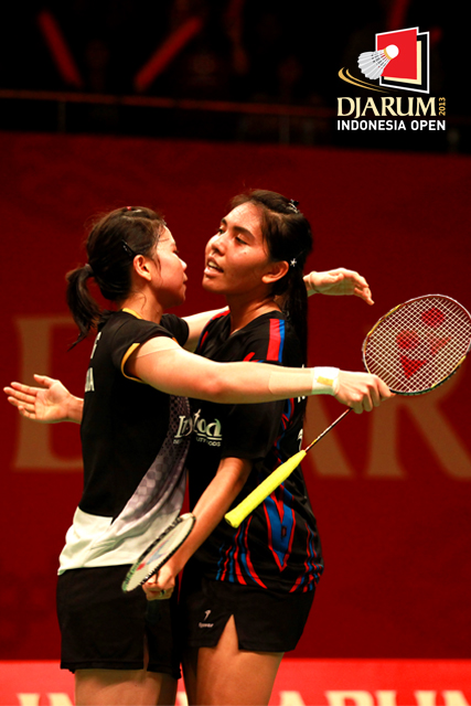 Nitya Krishinda Maheswari dan Greysia Polii (Indonesia) saling berpelukan setelah berhasil memenangkan duel dengan pasangan Gebby Ristiyani Imawan/Tiara Rosalia Nuraidah (Indonesia).