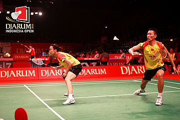 Pasangan ganda campuran China, Zhang Nan/Zhao Yunlei mengembalikan shuttlecock ke arah Shin Baek Choel/Jang Ye Na (Korea Selatan).