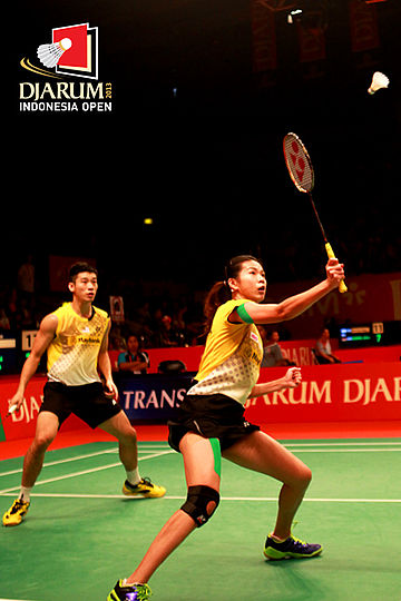 Tantowi Ahmad/Liliyana Natsir (Indonesia) bersiap melepaskan smash ke arah Peng Soon Chan/Liu Ying Goh (Malaysia).