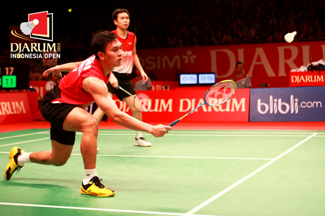 Mohammad Ahsan/Hendra Setiawan (Indonesia) mengembalikan shuttlecock ke arah Cai Yun/Fu Haifeng (China).